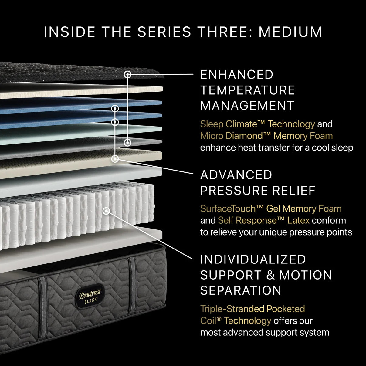 Discover where luxury meets innovation with Beautyrest Black®. Designed with Triple-Stranded Pocketed Coil® Technology, this mattress offers advanced individualized support and motion separation, Sleep Climate™ Technology for all-night heat transfer, and Beautyrest® Gel Memory Foam for contouring pressure relief. Experience our most advanced sleep system with Beautyrest Black®, so you can rest luxuriously.