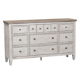 The Heartland 9-drawer dresser is sure to make a statement in any home, as its heavily distressed finish is adaptable to any space. The antique white finish and tobacco tops are accented by raised panels and antique brass hardware. The wood framed drawers and raised panels on the dresser sides and top creates a classic cottage style.