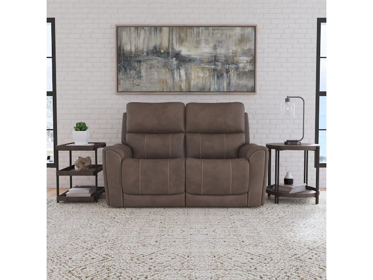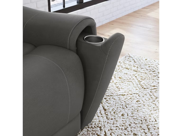 Power up and enjoy secretive perks with the Carter power reclining loveseat. This loveseat will be a statement in your home with its genuine leather look that is a durable, easy to clean fabric in two color choices. Flared arms, contoured seats and heavy thread stitching details give it a sleek, yet striking look. And it all comes with pop-out cupholders in the arms for discreet storage.