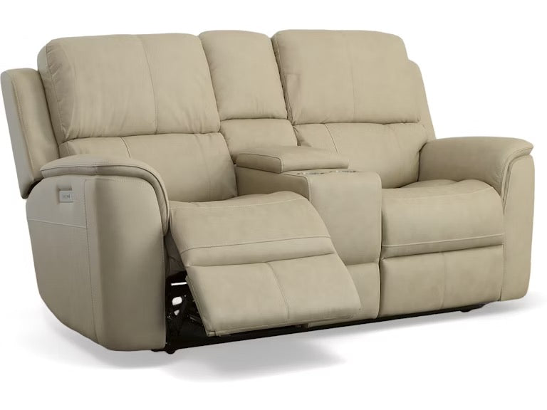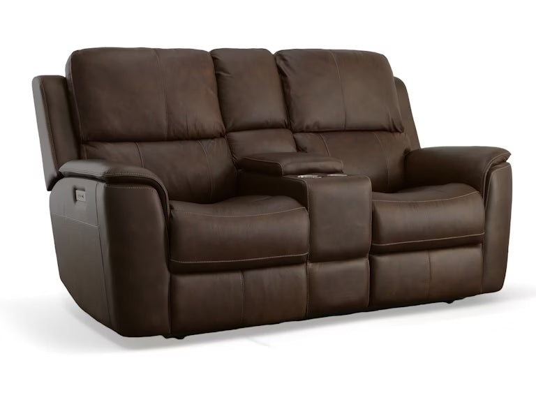 Treat yourself to a comfortable yet refined sitting experience with the Henry power reclining loveseat with console and power headrests and lumbar. This piece features a generously scaled frame, contoured seats, and padded arms with a unique sculptural shape and welt trim. A center console provides storage for belongings. Power recline, headrests and lumbar controls on both ends allow for customized comfort, and included USB ports provide convenient device charging. Our Zero Gravity recline technology gives the feeling of weightlessness while our patented Blue Steel Spring provides lasting seat support. Choose from one fabric or three top-grain leather options to suit your style.