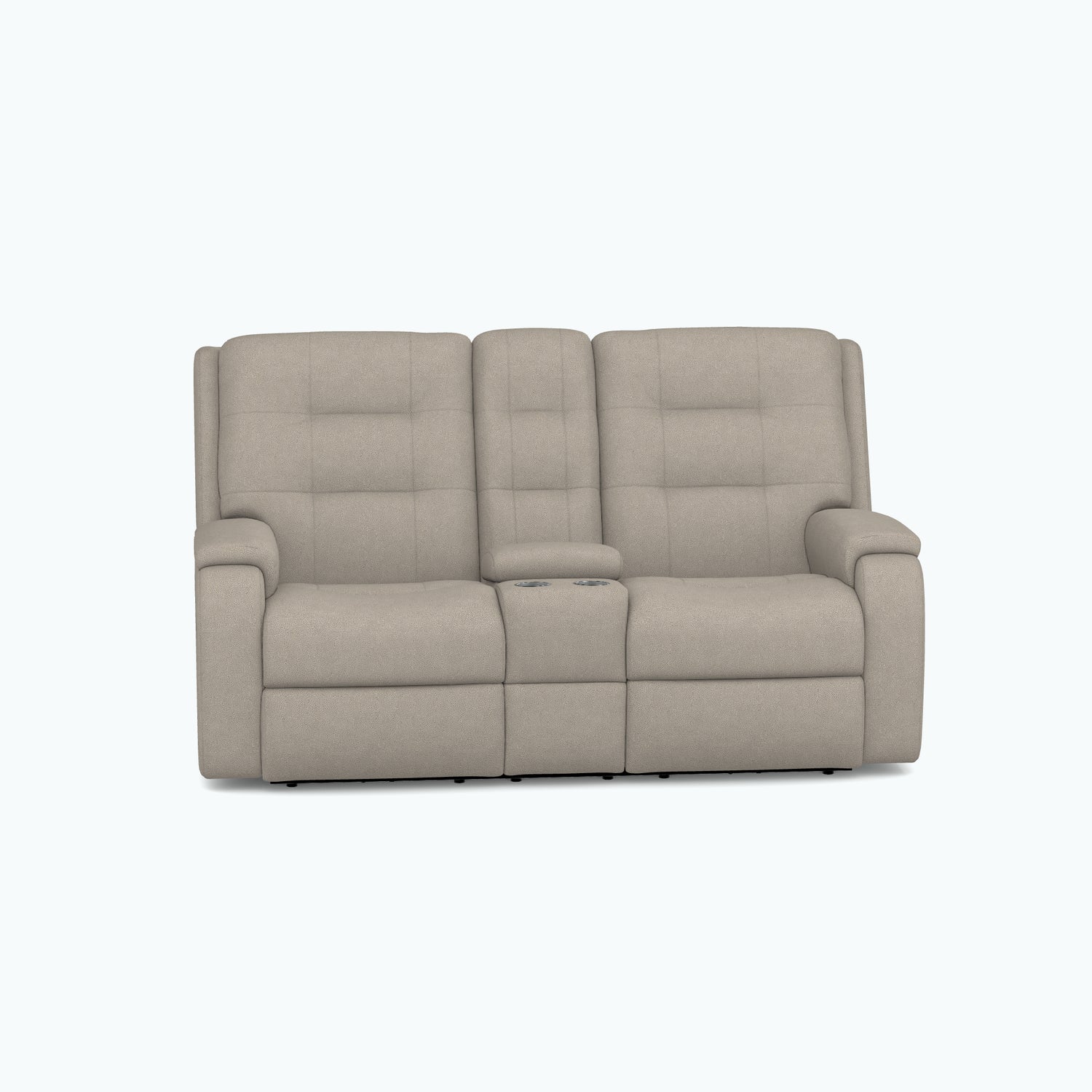 The spacious center console includes storage for glasses, magazines and other personal items and features two cup holders. Designed to enhance your well-being, Arlo has pull-tufted, triple-divide back cushions for a distinctive look and comfortable feel. A contoured seat with chaise pad takes pressure off your legs as your sit, while our patented DualFlex Spring System⢠provides firmness and flexibility. Rounded pad-over track arms cushion your forearmsâsomething youâll really appreciate if youâre spending hours gaming or streaming movies. Control the recline using an easy-access handle on either of the arms. To make Arlo your own, choose from over 250 fabrics options, including cleanable and durable performance fabrics.