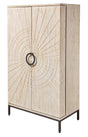 With a whitewash finish on select hardwoods and veneers, complemented by heavy distressing, the Shirley Wine & Bar Cabinet exudes vintage appeal. Its distinctive doors, featuring a routed circular design and arched door pulls finished in aged iron, add character and sophistication to any space.
